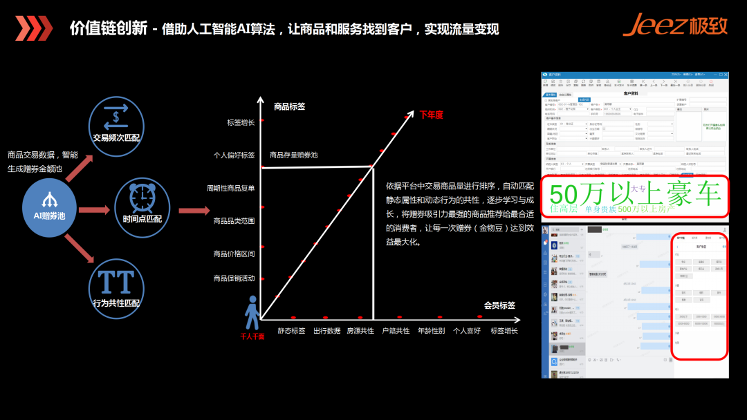 随着技术的不断创新,可以实现对商品、客户的标签画像管理,借助人工智能AI算法,让商品和服务去找到客户。通过对客户、商品进行双标签管理,标签的共有属性,如购买规律、购买性别、购买年龄段、价格范围、商品品类等等,将商品或服务推送给指定的客户群体,形成购买,实现业主增值服务收入的提升。