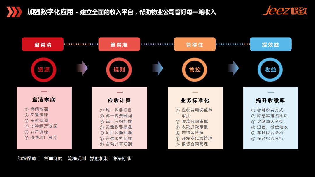4) 在我们对物管企业的主要成本进行有效管理之后,还需要管理好物管企业的每一笔收入,通过对“盘得清、算得准、管得住、提效益”等数字化目标的建设,管好物业每一笔收入。